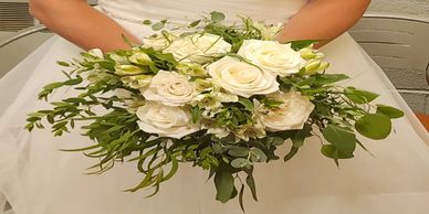 $100 & less. Simple and elegant bridal bouquet with matching boutonniere. Perfect for an elopement, courthouse wedding, or micro wedding.
